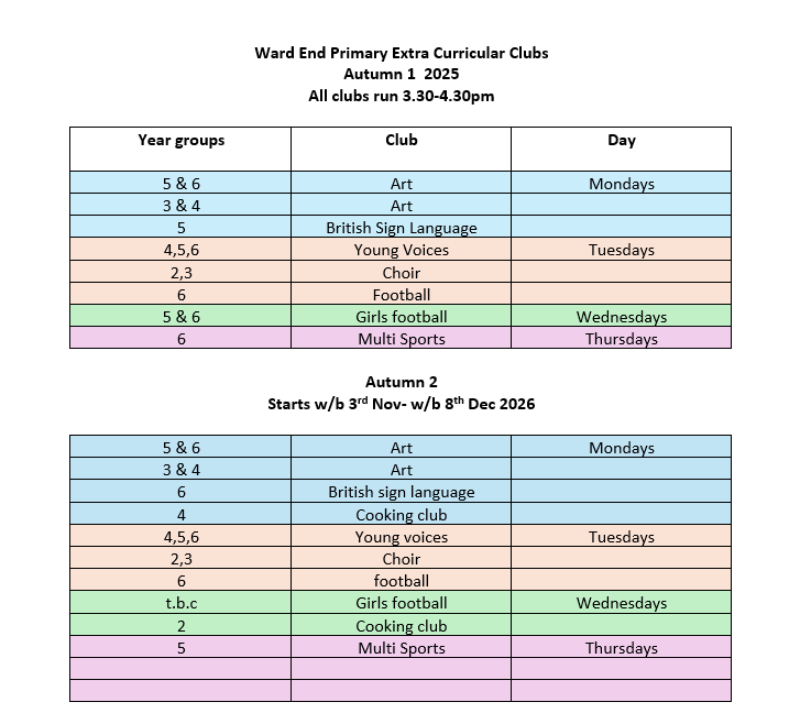 Clubs Parents / Carers / Clubs Before And After School Clubs Here are all of the clubs that happen at Ward End Primary